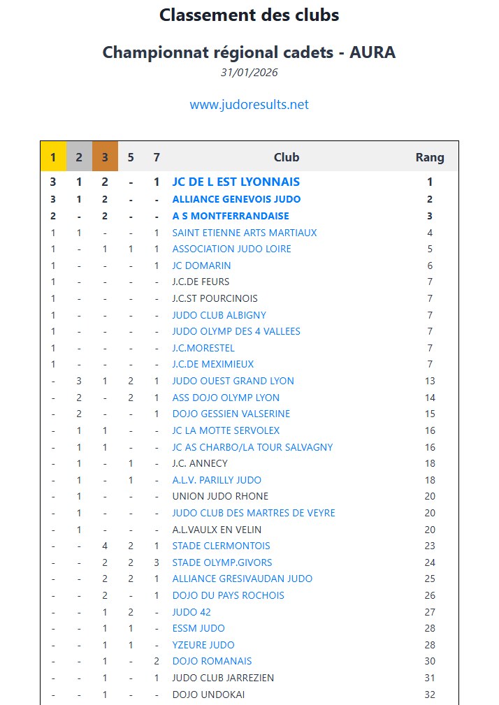 Résultats des championnats de régions AURA cadets 1ère division à Arnas du samedi 31 janvier 2026